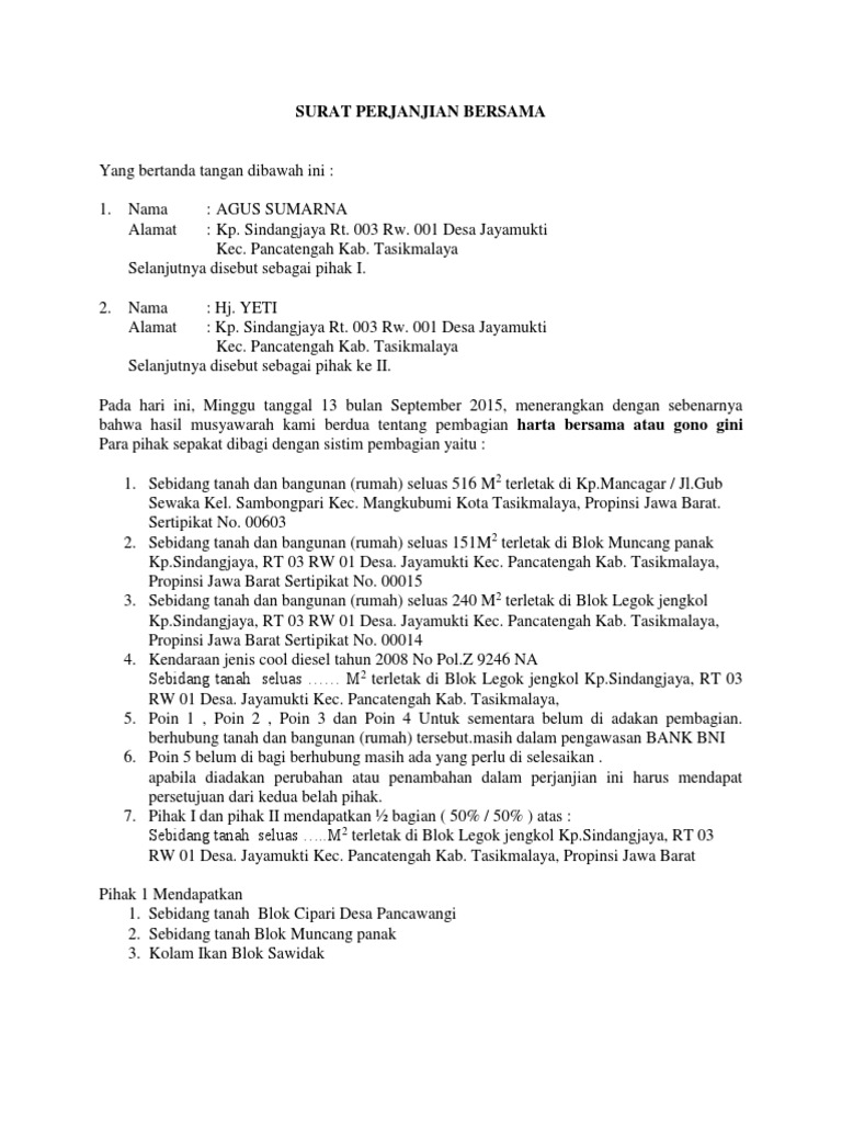 | Judul: Contoh Surat Perjanjian Pembagian Harta Bersama Atau Gono Gini Bagi Contoh Surat |